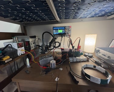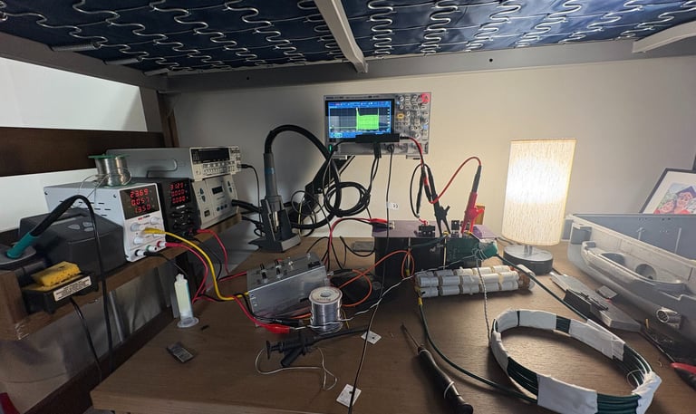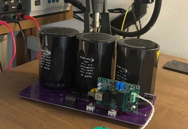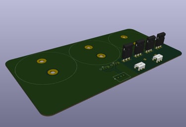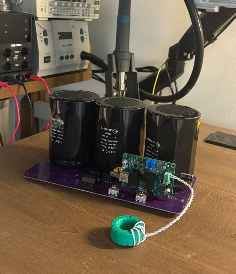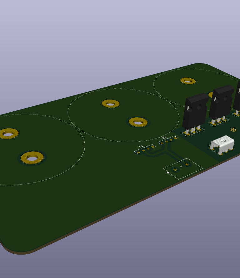 3x 2200uf 450v DC bus capacitors. Input from flyback converter for 400v nominal bus. New generation SIC mosfets by ONSEMI. PCB designed in kicad and produced by JLC PCB. Designed for minimal parasitics and adequate high frequency operation. (Left: inverter and mezzanine gate driver Right: PCB for the inverter designed in Kicad)