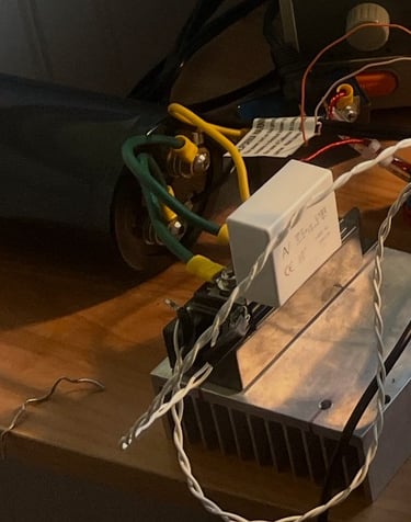 The power electronics were very simple, I found the control scheme to be much more complicated than the actual converter. First mains voltage is rectified and fed into that large capacitor for storage. I used a 100a 600v IGBT halfbridge module (two IGBT's in one!) from Fuji. There is a snubber capacitor bolted directly to the IGBT modules' Collector and Emitter to help with voltage spikes because we will be hard switching the inverter (turning the igbts on and off with disregard for the current flowing through it). The CE juction of the two IGBT's is attached to a very large inductor and a power film capacitor for smoothing and that is all there is to it.