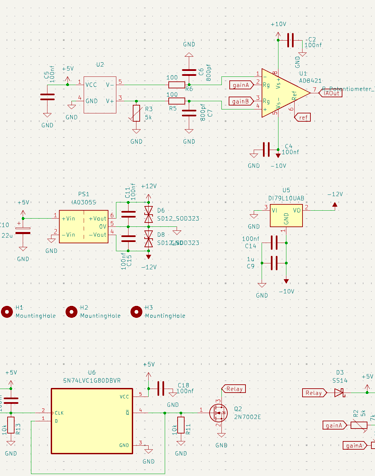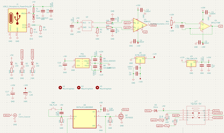 The circuit uses a simple instrumentation amplifier circuit using the AD8421. There is some compensation between U2 (the TMR sensor) and this IA. The rest is some power supply things, something of note is the isolated dc to dc converter I used to get my 12v rails. Although it is very convenient in the future I will probably replace it with a buck boost converter since they are hard to find and expensive. The circuit I use to control the relay is a D type flip flop that acts as a latching circuit for a push button. The relay controls the gain of the IA for hopefully 10x and 1x modes in practice. If this circuit works for rev2 I would like to add a microcontroller for auto zero and some other nice to have things.